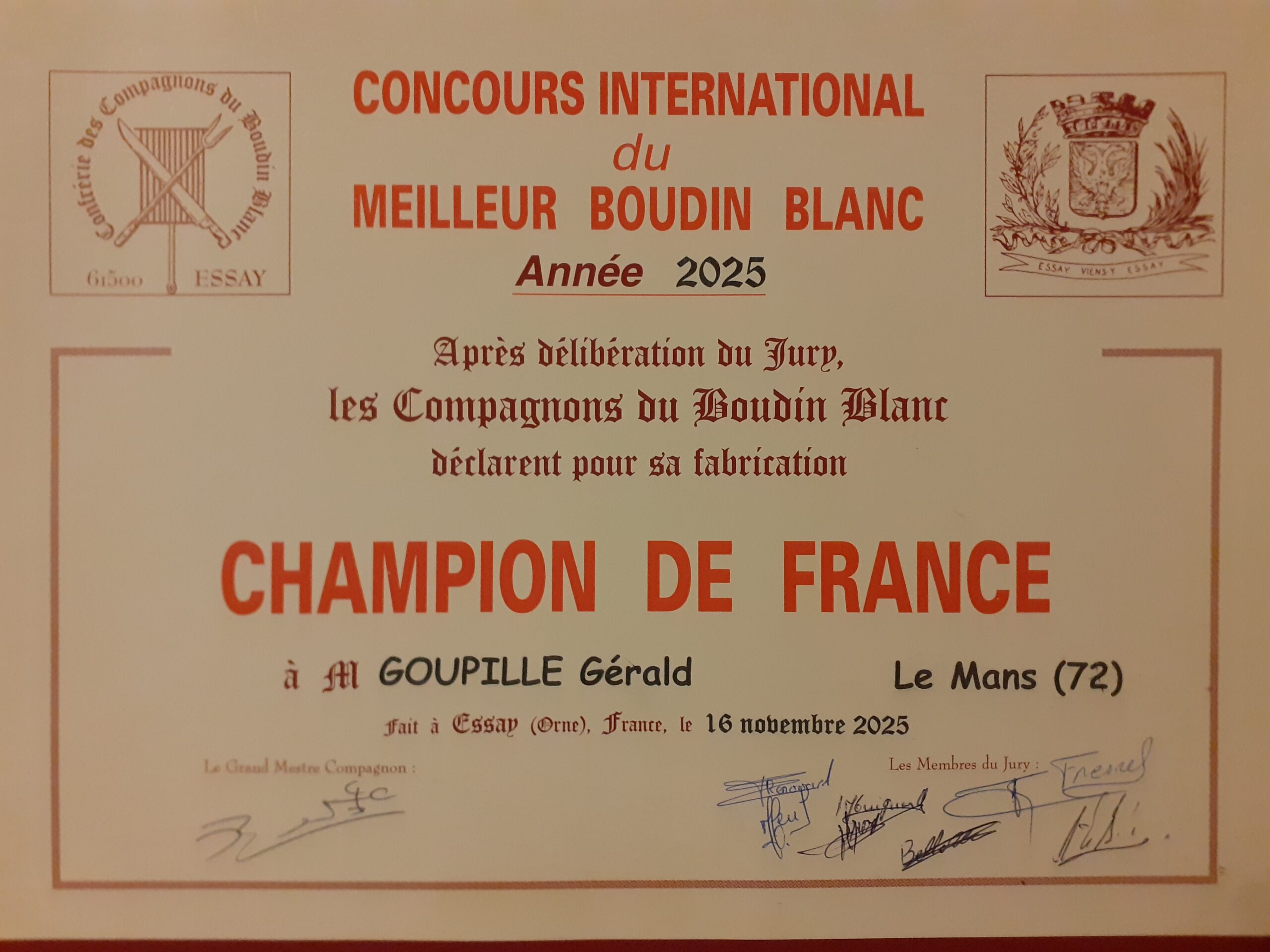 au concours international du meilleur boudin blanc par la Confrérie des Compagnons du Boudin Blanc d’Essay (61), catégorie Charcutier